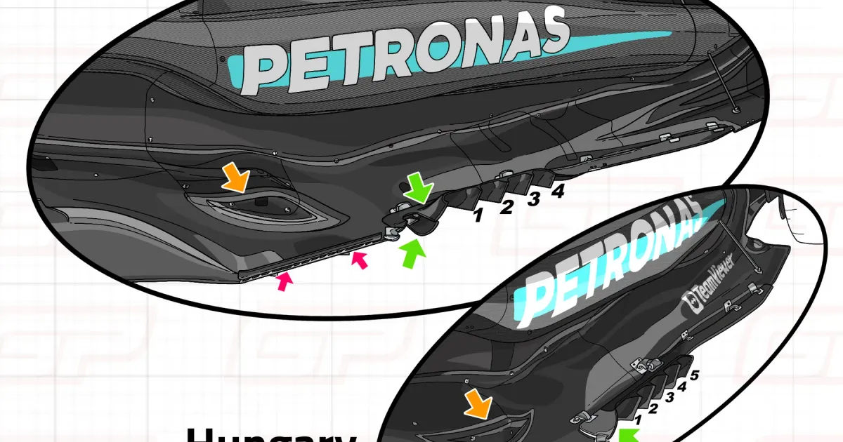 Among the notable modifications was a new floor design that mirrored features adopted by Red Bull, reducing its vortex generators from five to four. Additionally, the revamped design incorporated two small fins at the front edge of the floor connected by a metal support. This shift is indicative of Mercedes' focus on enhancing airflow management and downforce.